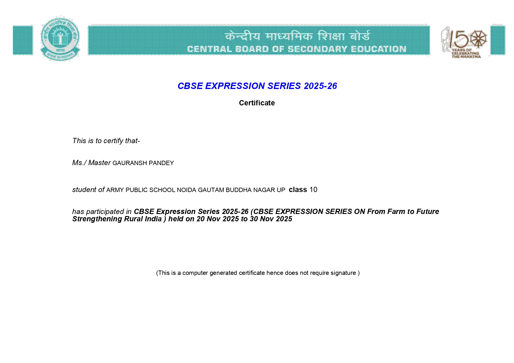 The CBSE 2nd Expression Series for the academic session 2025–26, themed “From Farm to Future: Strengthening Rural India,” was organised at the school level from 07–20 November 2025. Students participated enthusiastically across all categories, showcasing creativity and social awareness. The best entries uploaded on the CBSE portal included Tanveen Kaur (Class V) for Paragraph Writing in the Preparatory category, Sadhya Singh (Class VI) for Poetry in the Middle Stage, Gauransh Pandey (Class X) for Essay Writing in the Secondary Stage, and Navikka Saini (Class XI) for Poetry in the Senior Secondary category. The initiative strengthened expressive skills and rural development awareness among students.
